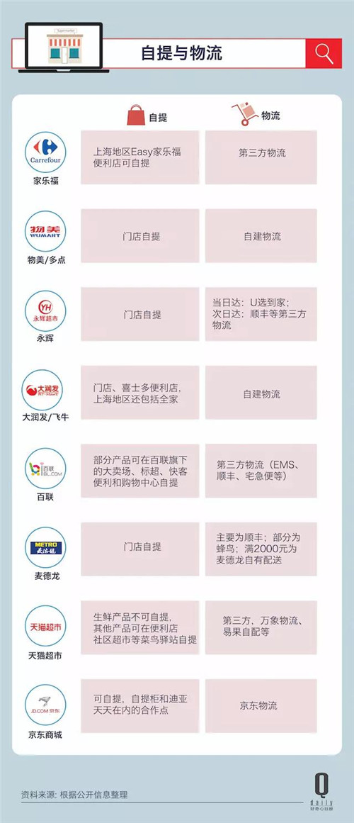 除了多點(diǎn)(物美)和飛牛網(wǎng)(大潤發(fā))用自有物流配送之外,其他的超市電商都是外包給第三方快遞公司。