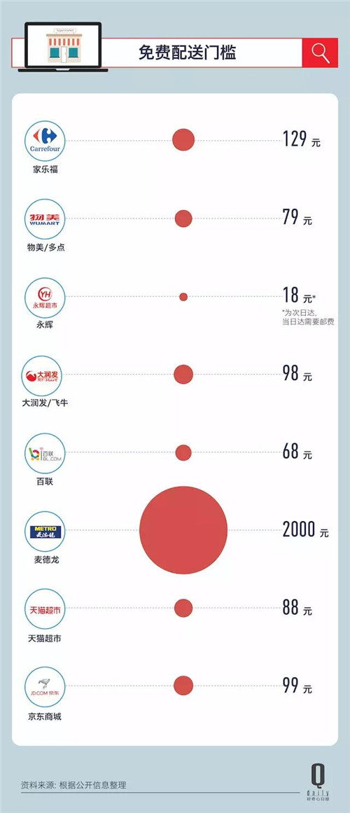 另外一個問題是生鮮免費(fèi)配送門檻比較高(和普通商品同價(jià))。比如,百聯(lián)需要 68 元,飛牛需要 98 元。其實(shí),包括更成熟的天貓超市和京東也有類似的問題,分別需要滿 88 元和 99 元才能免郵費(fèi),生鮮電商天天果園的包郵門檻也要 68 元。