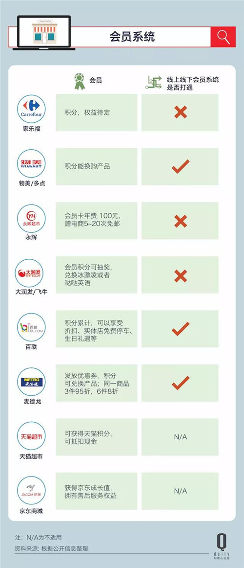 另外永輝、家樂福以及飛牛網(wǎng)(網(wǎng)上大潤發(fā))的線上線下會員體系都沒有打通。如果是打算做客群來留住消費(fèi)者,打通會員體系還是比較重要的。