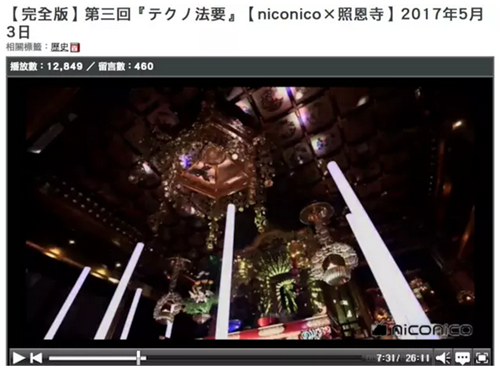 這是日本福井市照恩寺的一場(chǎng)超度儀式,跟以往莊嚴(yán)肅穆的宗教儀式相比,這場(chǎng)電音法會(huì)顯得極“不正經(jīng)”。除了用電子音樂誦經(jīng)、3D全息技術(shù)投影、五光十色的照明之外,這場(chǎng)法會(huì)還在日本彈幕網(wǎng)站鼻祖 niconico 上進(jìn)行了直播,引來 1.9 萬人觀看。