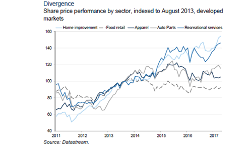 零售商大批破產(chǎn)的同時(shí),一些對電商“免疫”的行業(yè),在過去幾年表現(xiàn)卻明顯優(yōu)于其他消費(fèi)類行業(yè)。高盛在一篇報(bào)告中總結(jié)了以下四類:1、線下體驗(yàn)型消費(fèi)(如游樂場);2、“大件”商品和服務(wù)(如家具、教育);3、B2B類商品(如工業(yè)零件);4、有監(jiān)管約束的商品(如藥品)。