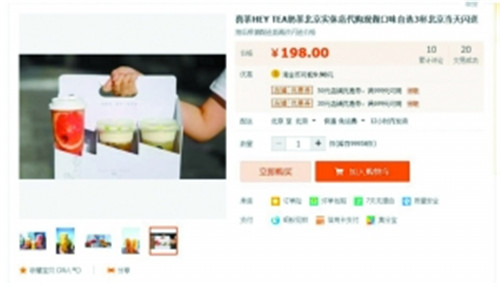 “炎熱的夏季,喜茶?排隊?我們可以免去你所有不必要的麻煩,你只需要坐在家里等著喝就好了!喜茶代購!”、“喜茶HEY TEA奶茶北京實體店代購,現(xiàn)做,口味自選3杯,北京當天閃送”……此類喜茶代購宣傳語在貼吧、微博、淘寶等各種網(wǎng)絡空間上不難找到,排長隊的喜茶總是伴隨著黃牛代購。