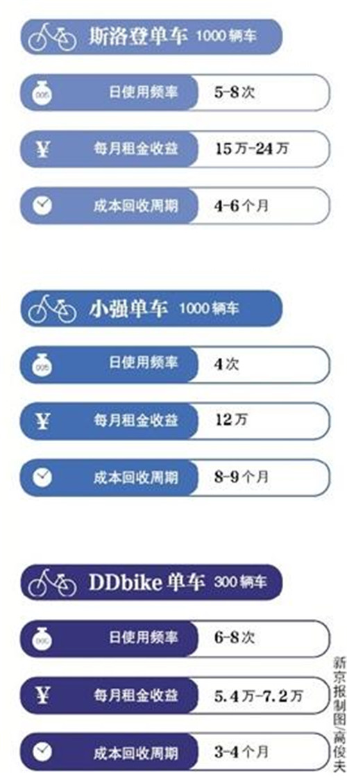 另一個(gè)來自成都的DDbike則稱,以15萬人口的縣城為例,投放300輛車,資金約13.8萬,客戶端軟件的使用費(fèi)用3萬,成本總計(jì)18萬元,每輛車的日均使用頻率為6-8次,以此計(jì)算3至4個(gè)月就可收回投資本金。