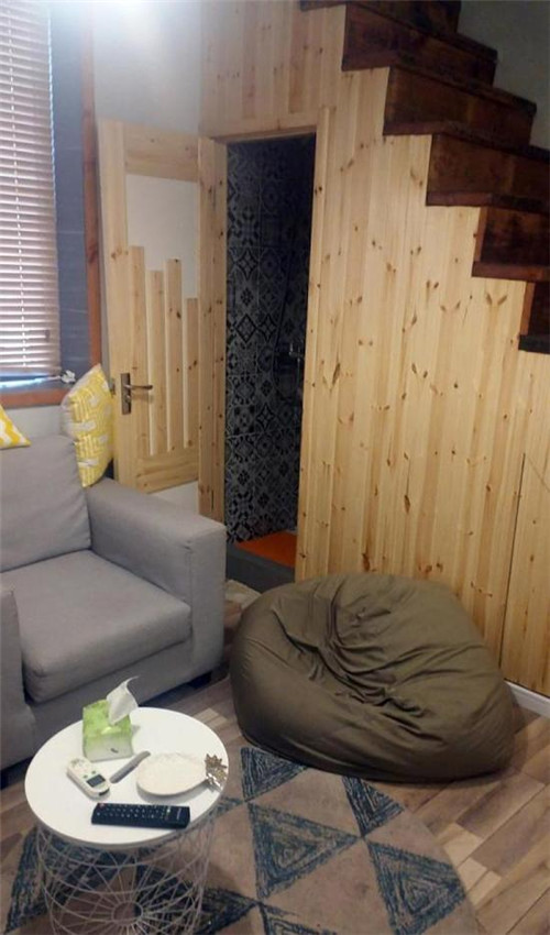 室內(nèi)總面積大概20平方米,被分隔為上下兩層。房屋雖小,家具及電器卻十分齊全。一樓有冰箱、洗衣機(jī)、電視等家電,一人坐的沙發(fā)和懶人沙發(fā)供休閑,布置緊湊,一角的衛(wèi)生間可容納一人洗漱;二層則放置了一張雙人床和一張氣墊床?!俺肆酪路环奖?,其余的體驗(yàn)我們都挺滿意的”,兩人告訴記者,“民宿更有老上海味道,退房也只需要把鑰匙放在門口的箱子里,非常方便。”