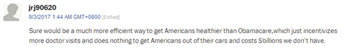 網(wǎng)友jrj90620:“對美國人的健康來說,共享單車可比奧巴馬醫(yī)保更有效。”