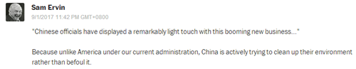 網(wǎng)友Sam Ervin:“‘中國官員對蓬勃發(fā)展的共享單車業(yè)務(wù)表現(xiàn)出柔性的監(jiān)管姿態(tài)?!绹灰粯樱袊诜e極地改善環(huán)境,而不是破壞環(huán)境。”