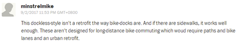 網(wǎng)友minstrelmike:“無樁式共享單車不適合遠(yuǎn)距離的騎行者,解決這個問題還得靠自行車道的規(guī)劃和城市的改造?!?/font>