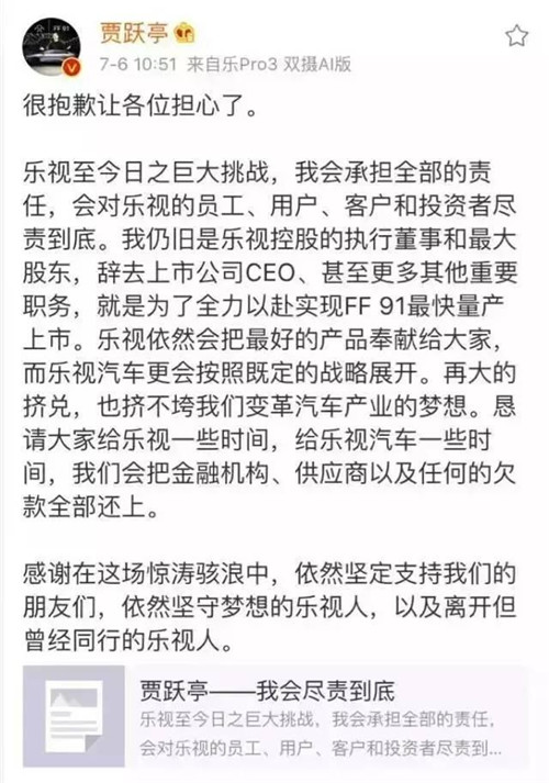 2、辭任之前賈躍亭剛發(fā)了道歉信,說會負責到底