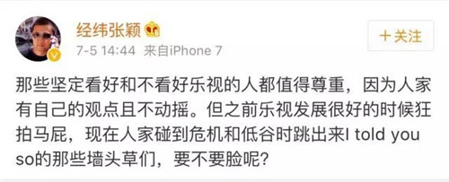 那些堅定看好和不看好樂視的人都值得尊重,因為人家有自己的觀點且不動搖。但之前樂視發(fā)展很好的時候狂拍馬屁,現(xiàn)在人家碰到危機和低谷時跳出來I told you so的那些墻頭草們,要不要臉呢?