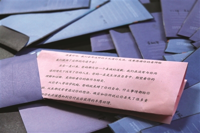 而最棘手則是一些父母與孩子之間有一些矛盾,“我們班一個(gè)男生因?yàn)楦咧袝r(shí)候爸媽管他管得太緊,以至于跟他們之間產(chǎn)生了很大的矛盾,他的父母知道有這樣一個(gè)可以給孩子寫信的機(jī)會(huì)之后,雖然很高興,但是也憂心忡忡,害怕孩子不愿意看他們的信,或者會(huì)因?yàn)檫@封信措辭不合適而加深對(duì)他們的誤解。我開(kāi)導(dǎo)了他們很久,他們才愿意寫一封信,希望可以解開(kāi)這個(gè)心結(jié)。”陳老師表示,這位同學(xué)的父母寫的信更像是一封和解信,在字里行間的深深愧疚中,她也感受到了家長(zhǎng)對(duì)于孩子的無(wú)奈和那一顆期望孩子快樂(lè)的心。