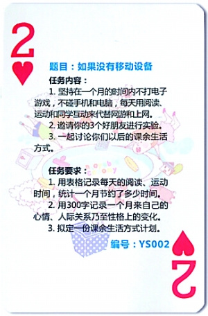 趙伊湄抽到了“紅桃2”。作業(yè)題目是:如果沒(méi)有移動(dòng)設(shè)備,同時(shí)給出了三項(xiàng)任務(wù),要求在一個(gè)月內(nèi)不打電子游戲,不碰手機(jī)和電腦,每天用閱讀、運(yùn)動(dòng)和同學(xué)互動(dòng)代替網(wǎng)游和上網(wǎng)。