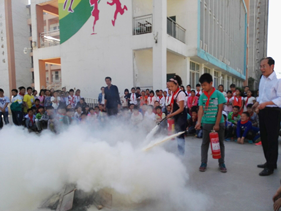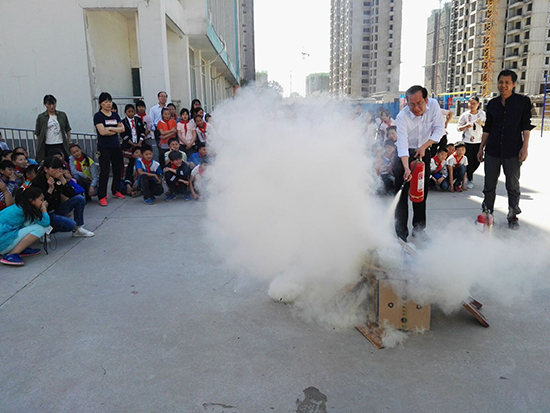 安全疏散演練完畢后,學(xué)校安全員為孩子們講解了校園防火、使用滅火器知識,以及火場逃生自救方法等消防安全常識,并現(xiàn)場指導(dǎo)師生干粉滅火器的使用方法。各班選出學(xué)生代表以及部分教師用滅火器進行了現(xiàn)場滅火,參與活動的師生嚴(yán)格認真地按照滅火方法進行著操作,燃燒的“火魔”瞬間被“消防員”撲滅,場上觀看的師生報以熱烈的掌聲。