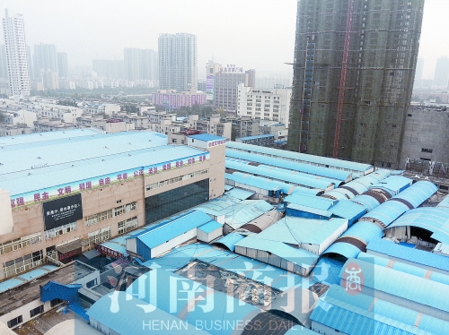 從現(xiàn)代童鞋城的窗戶向外看,盛祥置業(yè)的樓頂是一片藍(lán)色頂棚