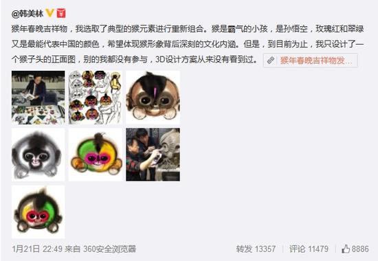 春晚吉祥物康康由“福娃”的創(chuàng)作者之一韓美林設(shè)計(jì),官方稱是以中國(guó)傳統(tǒng)水墨畫的藝術(shù)形式,生動(dòng)表現(xiàn)出“猴”的機(jī)靈活潑特點(diǎn)??纯错n老師的手稿,也是能get到喜慶的氛圍和毛茸茸的手感,還算是只討人喜愛的猴子↓