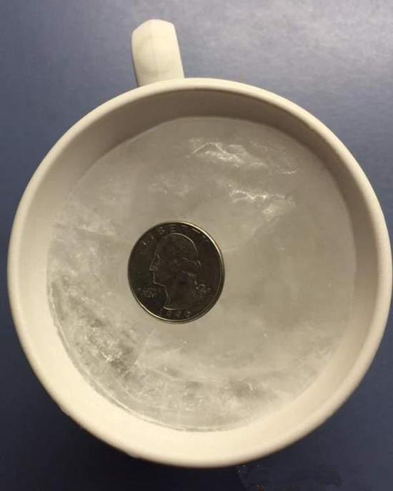 這時(shí)候只要在冷凍庫(kù)中放入一個(gè)「結(jié)冰的水杯」并在「水杯上放一枚硬幣」即可!