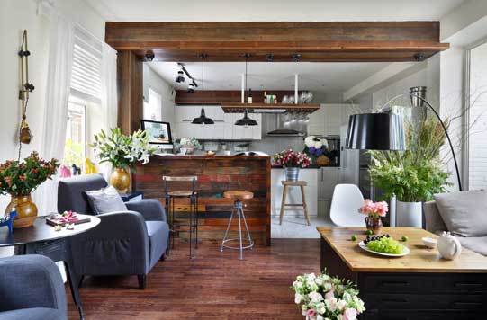雖然是小戶型,綠植的面積絲毫不含糊,屋里屋外都擺著大件的綠色盆栽;花束則插在更有設(shè)計感的瓶罐中。和睫毛聊起了為愛布置花房的蓋茨比,雖然不如他闊綽,也真像把花園搬進了家里。