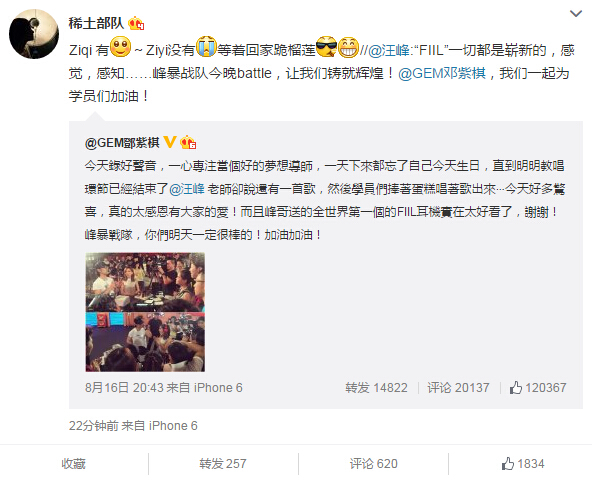 近日,一張章子怡發(fā)布會挺著“大肚”的照片引發(fā)網(wǎng)友熱議,雖然只是假扮孕婦,卻引來大波網(wǎng)友詢問何時準(zhǔn)備要寶寶,可見網(wǎng)友對兩人感情生活的關(guān)注。8月16日,鄧紫棋在微博上曬出汪峰為其過生日的照片,17日中午,汪峰轉(zhuǎn)發(fā)此微博并稱要為學(xué)員們加油,17日下午,章子怡回復(fù)汪峰:“Ziqi有~Ziyi沒有,等著回家跪榴蓮。”