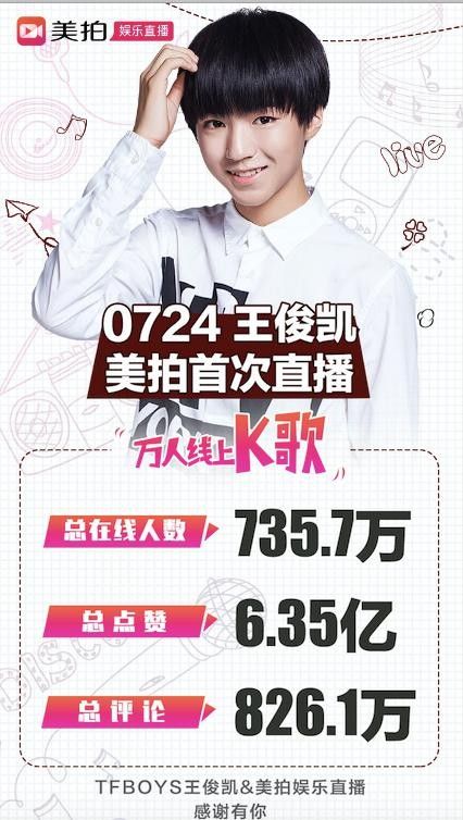 “大哥”王俊凱作為TFBOYS的隊(duì)長(zhǎng)及團(tuán)隊(duì)核心,一直備受90后乃至00后粉絲追捧。7月24日下午5點(diǎn)王俊凱開啟了在美拍的個(gè)人直播首秀,與“小螃蟹”們進(jìn)行了長(zhǎng)達(dá)五十分鐘“嗨歌模式”。直播開始正式開始后,觀眾突破六百萬(wàn),點(diǎn)贊數(shù)超過(guò)五億,而總評(píng)論數(shù)更是達(dá)到了驚人的826萬(wàn),毫無(wú)疑問成為全網(wǎng)互動(dòng)數(shù)最高的直播,同時(shí)更輕松登上微博微博熱門話題榜單,收獲1.5億閱讀量。