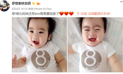 林志穎的長(zhǎng)子Kimi已經(jīng)6歲,雙胞胎兒子則是2015年12月才生下來,他4日在社交網(wǎng)站曬出雙胞胎兒子的照片,用童稚的語氣寫道“耶!爸比媽咪還有kimi哥哥要回家了,好想你們喔”,照片中可以看到2個(gè)兒子穿著印有8個(gè)月的寶寶衣,似乎在暗示雙胞胎又長(zhǎng)大1個(gè)月了。