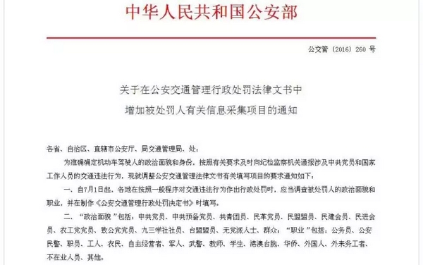 2016年7月1日起,機動車駕駛人實施交通違法行為后,公安交通管理部門在對交通違法作出行政處罰時,被處罰人的政治面貌和職業(yè)信息將被調查,涉及中共黨員和國家工作人員的將被通報紀檢監(jiān)察機關。