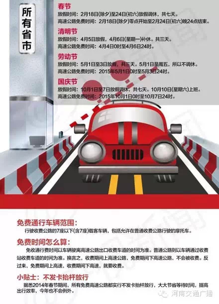 2015年春節(jié)放假安排時間表已經(jīng)出爐,春節(jié)高速公路免費時間具體從哪天開始?持續(xù)多長時間?哪些車型可以免費通行?