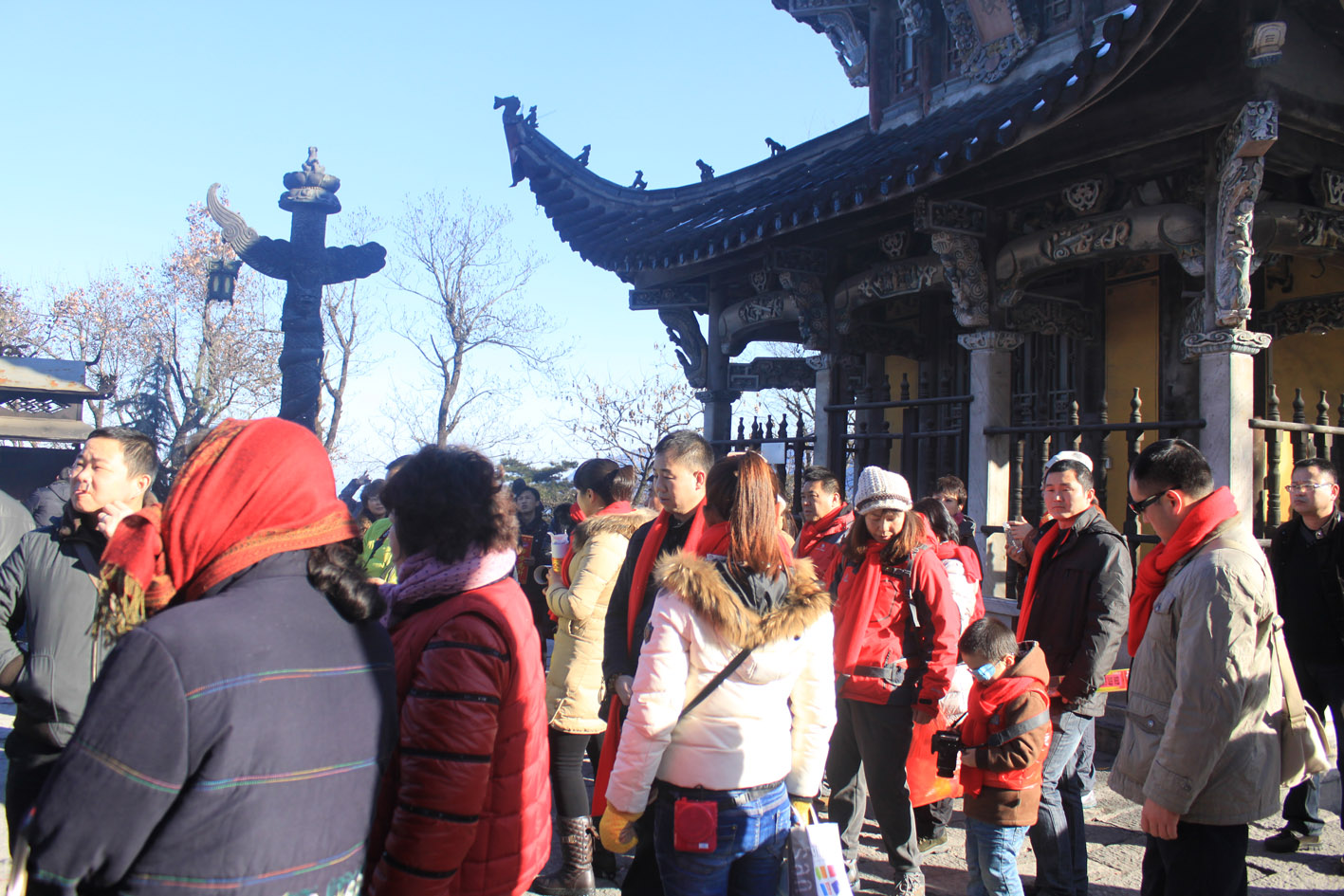 我們的自駕車隊12月31號抵達九華山之前,這里剛剛下過一場雪,湛藍色的天空、漫山遍野銀裝素裹,明黃色的寺廟在白雪的映襯下別有一番景致。在第一天登百歲宮時,大家相互鼓勵,并不時調侃氣氛,讓不少車友第一次感受到了雪中登山的樂趣。