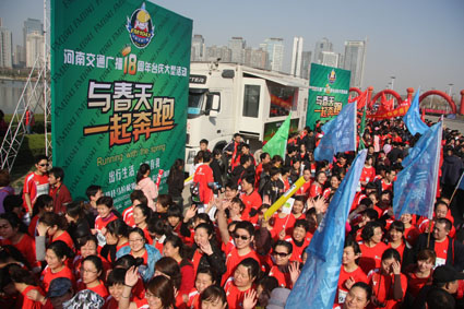 3月27上午,綠城鄭州陽光明媚,春意盎然,2011年中國鄭開國際馬拉松賽分別在鄭州市鄭開大道和鄭東新區(qū)商務(wù)內(nèi)環(huán)鳴槍舉行,來自28個國家和地區(qū)的近3萬名選手參加了比賽。河南交通廣播也組織了由1041名車友組成的“千人跑友團(tuán)”參賽,大家一起跑進(jìn)春天,共同慶祝交通廣播成立18周年。