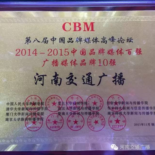 FM1041河南交通廣播榮獲2014-2015中國品牌媒體百強廣播媒體品牌10強。在河南廣播媒體中,僅此一個。這也是對河南交通廣播在節(jié)目、活動、服務方面成績的肯定。