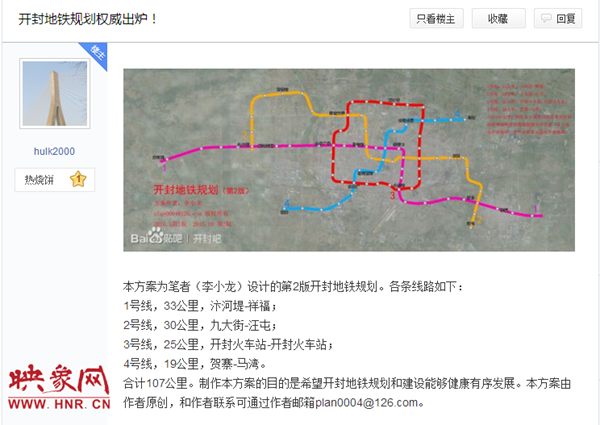 【傳聞】11月初,網(wǎng)絡(luò)上謠傳“開封要修建地鐵,市區(qū)內(nèi)規(guī)劃了4條線路”不少開封市民在網(wǎng)上看到一則關(guān)于開封要修建地鐵的消息,引來一片熱議,同時(shí)市民在論壇上也有發(fā)帖熱議。