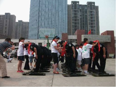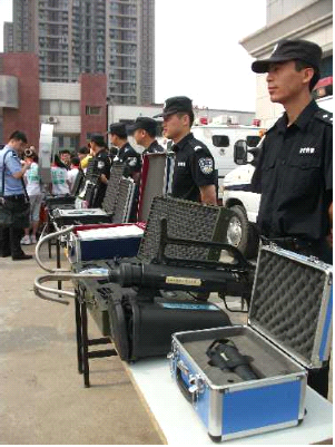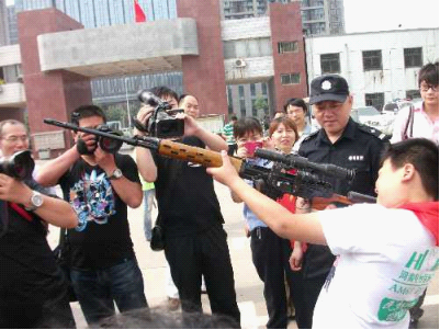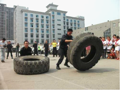 5月31日上午,鄭州市公安局特警支隊大院里熱鬧非凡,35名小學(xué)生成為這里的特殊客人。在特警支隊副隊長弋遂勤的帶領(lǐng)下,大家興致勃勃地逐一體驗了各類防暴器械,觀看武警戰(zhàn)士的絕技表演。特警四大隊演示的警棍盾牌術(shù)剛毅雄壯,特警新警大隊的新式擒敵拳颯爽英姿,當(dāng)備戰(zhàn)“2012全國公安特警比武”的特警猛士一口氣搬起二百斤的巨型輪胎時,大家不由得發(fā)出一陣驚呼!