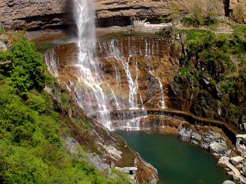 紅石河碧水橫溢、紅綠相映、色彩斑斕、明麗如畫,因海拔1100米被譽(yù)為“太行天河”。從紅石河畔俯瞰,山谷幽深、流水潺潺,河水順著光潔平整、錯(cuò)落有致的紅石板流淌不息,直沖而下形成又一著名景點(diǎn)——天河大瀑布。紅石河的右畔是觀音洞,觀音洞里的泉水常年不斷、甘甜可口,用來泡茶增三分香,煮飯?jiān)黾尤痔穑F(xiàn)在敞開供應(yīng),保你一杯解風(fēng)塵,二杯去疲乏,三杯大汗落。 八里溝的山,八里溝的水,甚至八里溝的每一塊石頭都引起世界的好奇。景區(qū)森林覆蓋率達(dá)90%,如今,八里溝景區(qū)已經(jīng)成為國內(nèi)很多前衛(wèi)、時(shí)尚的游客非常向往的一個(gè)人間天堂、世外桃源,也是春季旅游的經(jīng)典線路。