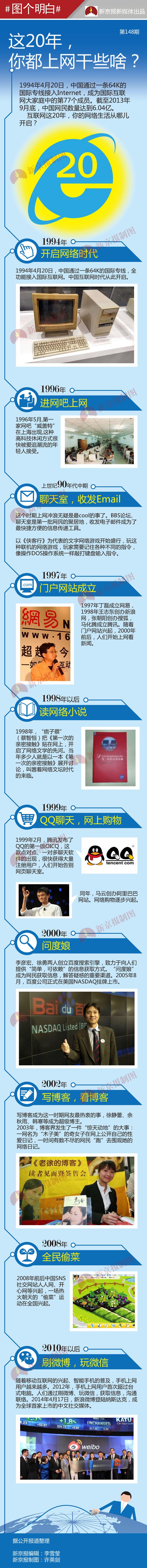 1994年4月20日,中國(guó)通過一條64K國(guó)際專線接入Internet,成為國(guó)際互聯(lián)網(wǎng)大家庭中的第77個(gè)成員。截至2013年9月底,中國(guó)網(wǎng)民數(shù)量達(dá)到6.04億?;ヂ?lián)網(wǎng)這20年,你的網(wǎng)絡(luò)生活從哪兒開啟?