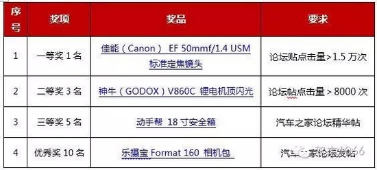 為了滿足眾多攝影愛好者和車迷們的拍攝需求,中原國際車展聯(lián)合攝影愛好者協(xié)會共同舉辦“中原國際車展汽車攝影大賽”。只要你愛車、喜歡拍照,就可以報名參賽!此外,在汽車之家發(fā)布論壇帖可以獲得大獎喲~