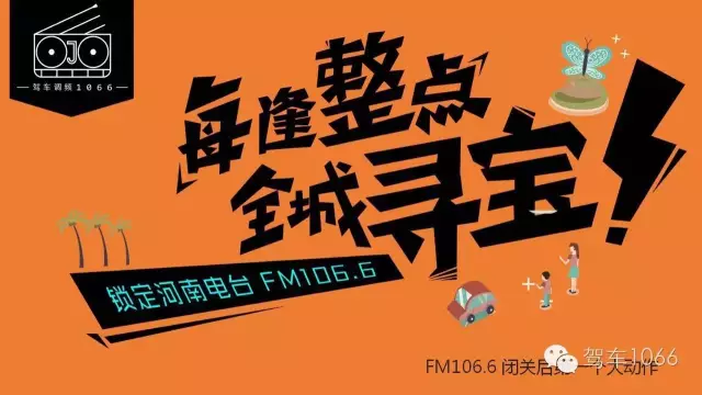 參與方式:現(xiàn)在立刻馬上關(guān)注“駕車1066”官微-每天收聽FM106.6-獲取每個(gè)整點(diǎn)通關(guān)密語-回復(fù)通關(guān)密語到官微后臺(tái)-即可獲得藏寶圖-到指定地點(diǎn)領(lǐng)獎(jiǎng)呦!