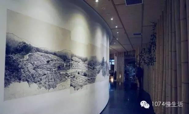 西舍乘電梯而上,卻又是另一番天地。不論是擺放在長(zhǎng)案上,綻放的桃花,還是精致的茶具,都深深將人吸引,長(zhǎng)長(zhǎng)的過(guò)道用竹子裝飾,不禁讓人想到“寧可食無(wú)肉,不可居無(wú)竹”的詩(shī)句,水墨畫(huà)也被搬上墻壁,更顯得雅致和店主的巧心思。