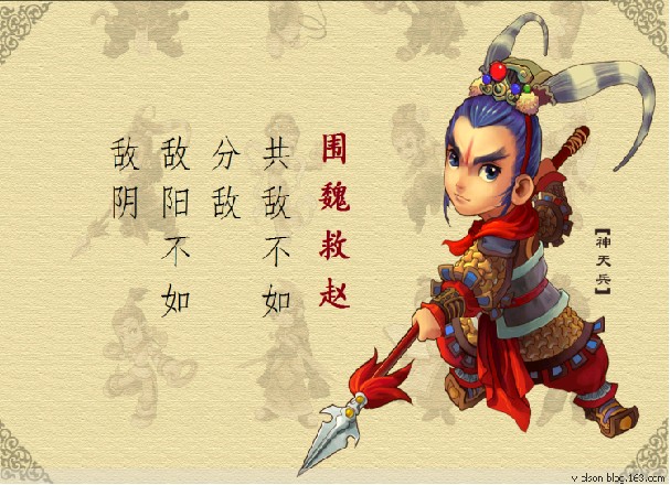 譯文:攻打兵力集中的敵人,不如設法使它分散兵力而后各個擊破;正面攻擊敵人,不如迂回攻擊其薄弱空虛的環(huán)節(jié)。本指圍攻魏國的都城以解救趙國。后指襲擊敵人后方的據(jù)點以迫使進攻之敵撤退的戰(zhàn)術?,F(xiàn)借指用包超敵人的后方來迫使它撤兵的戰(zhàn)術。