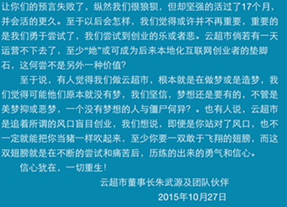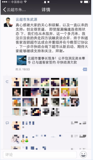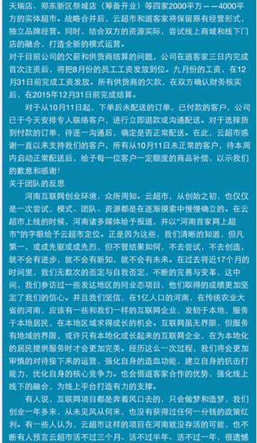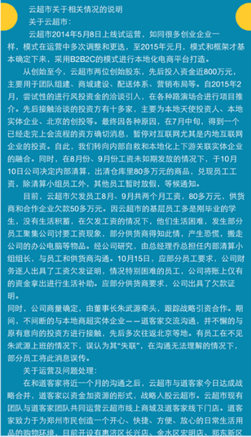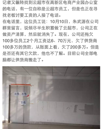 最近一周,在鄭州電商圈悄悄地流傳著這個消息……云超市倒閉了?董事長朱武源失聯了?讓我們看一下26號各媒體發(fā)出的消息: