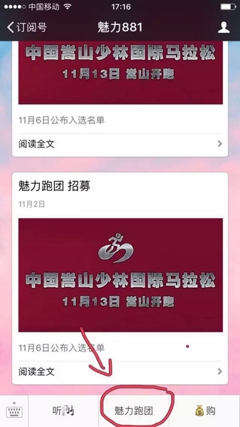 如果你想?yún)⒓颖敬伪荣惖?公里跑項目,請在魅力881微信公眾平臺點擊菜單“魅力跑團(tuán)”回復(fù)以下信息: