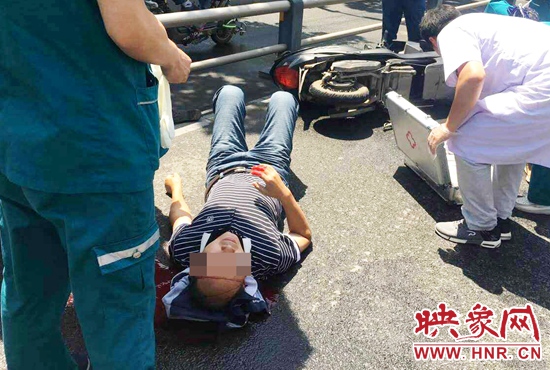 5月27日上午,鄭東新區(qū)平安大道商務(wù)外環(huán)路口附近,一年輕男子騎著電動(dòng)車上班,因?yàn)闉⑺噭偨?jīng)過路面濕滑,男子不慎摔倒著地,頭部重傷造成大量出血。