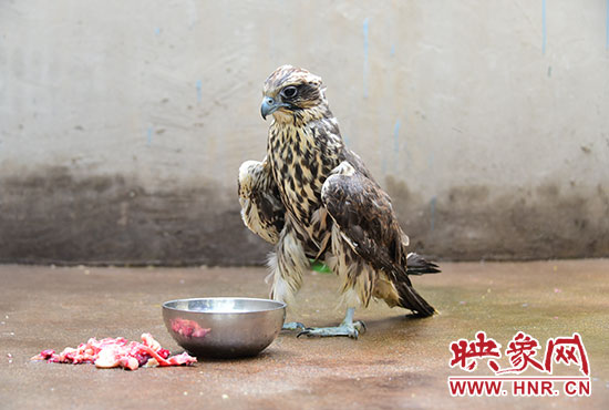 中牟縣林業(yè)局接到警方的電話后,工作人員冉占杰、朱鑫驅(qū)車趕到現(xiàn)場(chǎng),卻也沒有認(rèn)出該鳥的鳥名。工作人員將大鳥帶回單位后,進(jìn)行喂水喂食。隨后,他們將圖片發(fā)至鄭州市林業(yè)局野生動(dòng)物救護(hù)站。董朝偉站長(zhǎng)認(rèn)出:它非同小可,竟然是國家二級(jí)重點(diǎn)保護(hù)動(dòng)物,蒙古國國鳥,珍稀而罕見的獵隼。