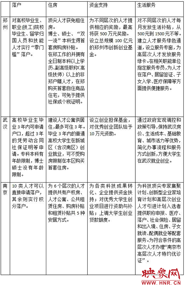 而在鄭州之前,南京和武漢也發(fā)布了一系列人才吸引政策,這三個(gè)城市各自在人才吸引方面有什么樣的側(cè)重?政策“含金量”和操作性如何?映象網(wǎng)將鄭州、武漢、南京的人才吸引政策做一對比,從落戶、住房、資金支持、生活服務(wù)四個(gè)方面進(jìn)行比較,一張表讀懂三個(gè)城市的“搶人”戰(zhàn)略。