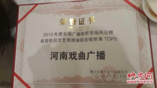 2014年8月20日晚上,國內知名廣播收聽率調查公司賽立信媒介研究有限公司在成都舉行發(fā)布會,授予河南電臺戲曲廣播娛樂976“2013年度全國廣播收聽率TOP5”榮譽稱號。