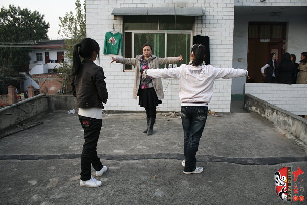稍有空余他們就自覺(jué)的練功,圖為劉粉霞在為學(xué)生演示動(dòng)作