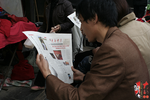 劇團(tuán)演員認(rèn)真閱讀河南電臺(tái)戲曲廣播《大韻中原》報(bào)紙