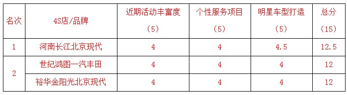 河南長江北京現(xiàn)代、世紀鴻圖一汽豐田、裕華金陽光北京現(xiàn)代 分列【紅榜】1,2,3名!