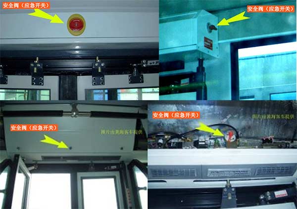 公交車的車門上方配有一個(gè)車門開啟安全閥,此安全閥在車輛斷電、斷氣的情況下也可以打開車門。離門近的乘客只要將此安全閥旋轉(zhuǎn),然后手動(dòng)將門打開下車即可。