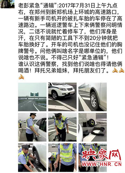 據(jù)介紹,7月31日9時許,河南省公安廳高速交警總隊(duì)一支隊(duì)執(zhí)勤民警徐玉成、余曉偉巡邏到機(jī)場高速與鄭州西南繞城高速互通處附近時,看到北向南方向一輛白色轎車停在高速路邊,上前一看車輛前輪輪胎爆胎了,司機(jī)急著去開會卻不會修車,急得滿頭大汗卻無從下手,民警了解情況后,二話沒說在酷暑高溫天氣迅速幫司機(jī)把車胎換好,司機(jī)連聲表示感謝,由于當(dāng)時急著去開會,沒有來得及問出民警姓名,于是就出現(xiàn)了開頭“緊急通緝”的一幕,公司領(lǐng)導(dǎo)和員工也紛紛轉(zhuǎn)發(fā)正能量,“通緝”找人。伸手幫一把,傳遞正能量一大片。