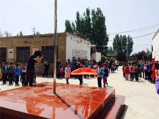 少先隊員向參加捐贈儀式的愛心代表人士敬獻紅領巾,并獻上孩子們花費一下午時間親自采摘的鮮花,并舉行升國旗儀式。