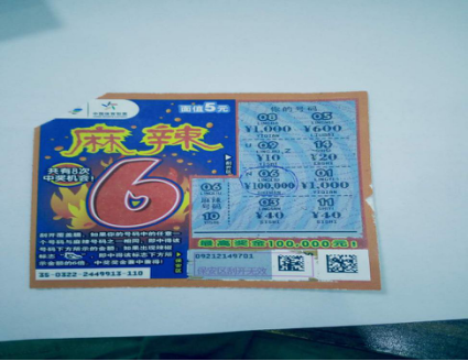 “麻辣6”玩法簡(jiǎn)單。刮開覆蓋膜,如果你的號(hào)碼中的任意一個(gè)號(hào)碼與中獎(jiǎng)號(hào)碼之一相同,即中得該號(hào)碼下方所示的金額;如果出現(xiàn)辣椒標(biāo)志,即中得該標(biāo)志下方所示金額的6倍。獎(jiǎng)金兼中兼得。(李棟)