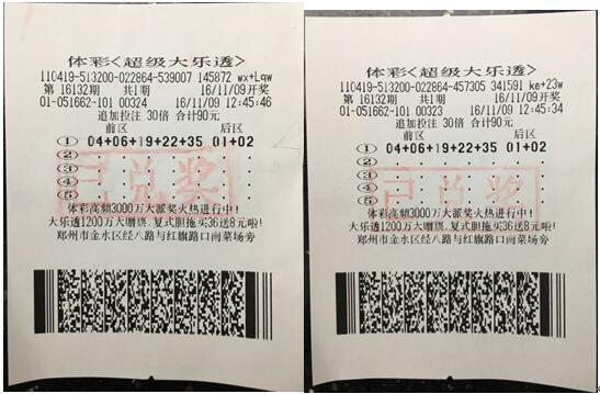 彩民在鄭州東區(qū)體彩分中心兌獎(jiǎng)的兩張彩票--- 60倍